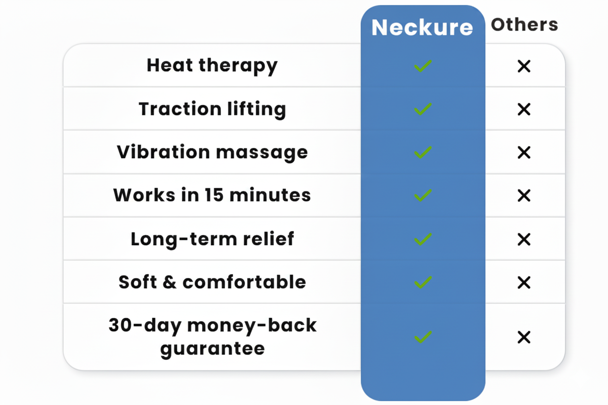 Unlike bulky or harsh neck devices, Neckure™ features ultra-soft memory foam and easy controls for a gentle, customized fit. Just 15 minutes a day provides soothing heat, relaxing massage, and real relief—without strain or discomfort.